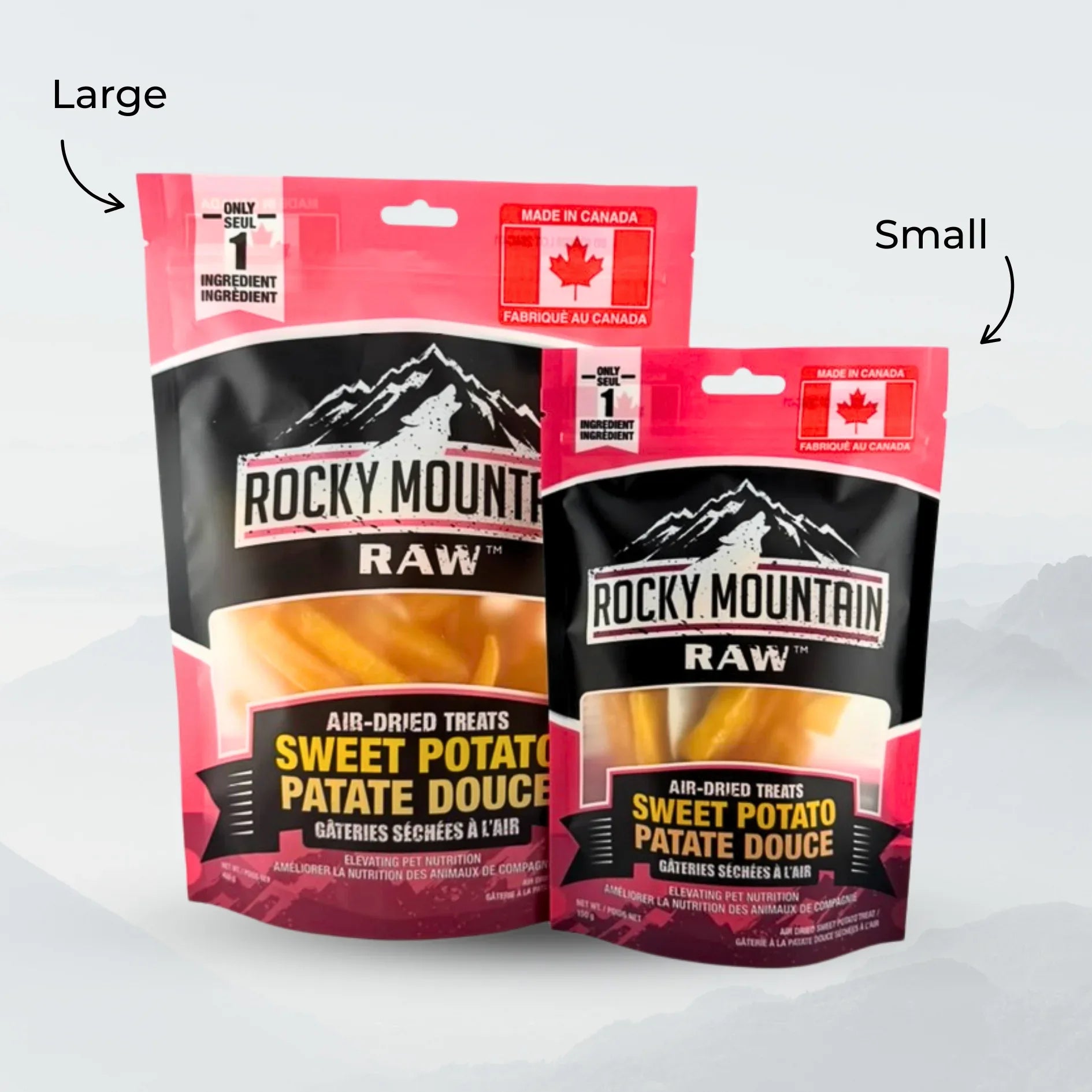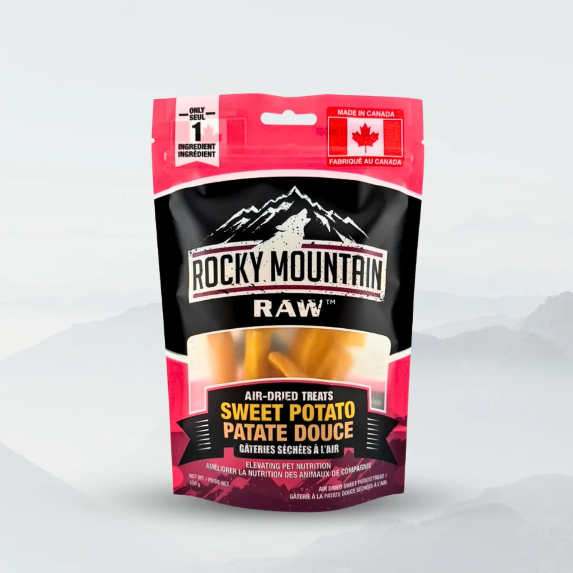 Each 150g bag is packed with premium quality sweet potato sticks, carefully air-dried to preserve nutrients and natural flavor. Our treats are produced right here in Canada, maintaining the high standards you've come to expect from Rocky Mountain Raw.